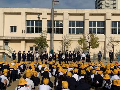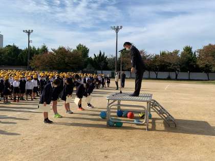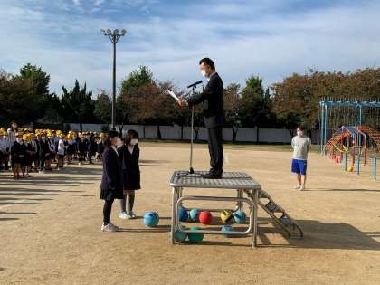 校長先生から、「先週、赤い羽根募金ありがとうございました。あいさつ運動でしっかりあいさつできましたね。」、「交通事故に遭わないために、道の歩き方や横断歩道の渡り方に気を付けましょう。」とお話がありました。