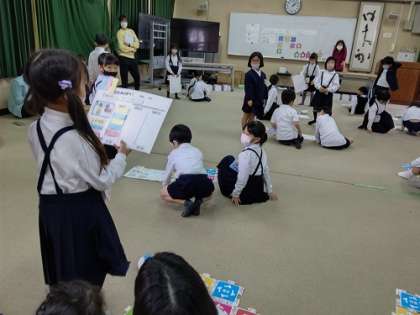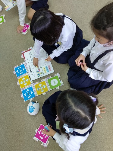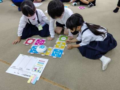 5時間目に多目的室におきまして、1年3組のプログラミング学習の研究授業を行いました。ロボットのアリロを使って、「くねくねみちをつくってアリロをはしらせよう」に取り組んでます。