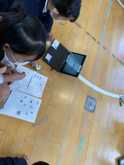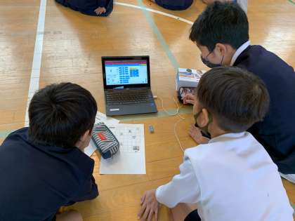 6時間目はChromebookを使って、mblockのソフトでプログラミングを行いました。code rockyロボットを用いて、班で協力し課題の条件を考えて、マス目のプリントを用いて出発地からGゴールまでのプログラムを考えています。できあがったプログラムを紹介し、交流することができました。