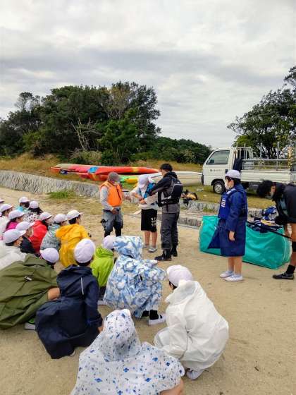ライフジャケットの着方を教えてもらっています。