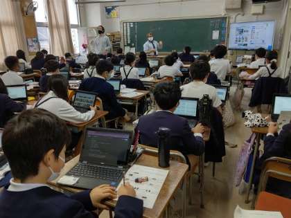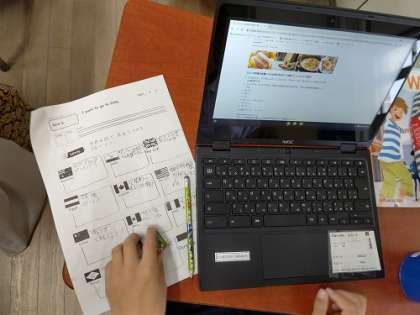 C−NETの先生と「I want to go to 〜 」世界の国で有名なものを調べようの学習をChromebookを使って、調べながら進めています。