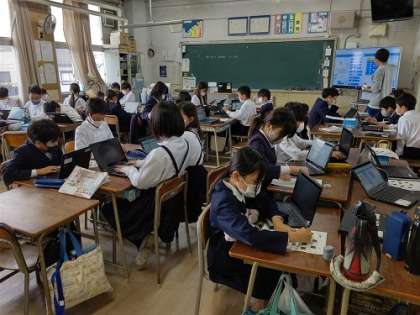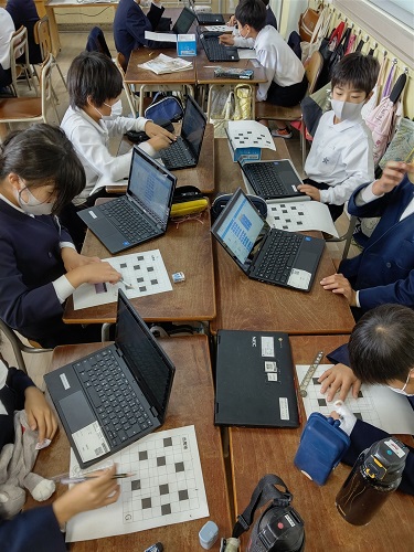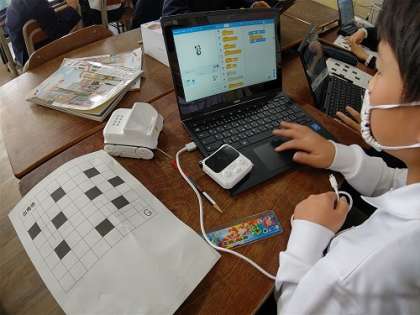 Chromebookを使って、mblockのソフトでプログラミングを行い、code rockyロボットを制御しています。めあてとして「code rockyを動かしてみよう」ということで、マス目のプリントを用いて出発地からGゴールまでのプログラムを考えています。