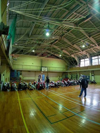 避難訓練で、各部屋から体育館まで、経路を確認しました。