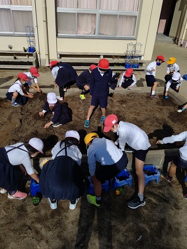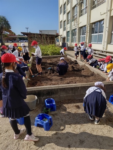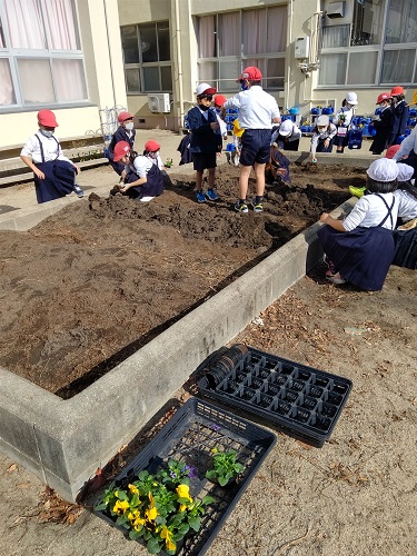 植木鉢で育てたパンジーを、中庭の花壇に植え替えています。