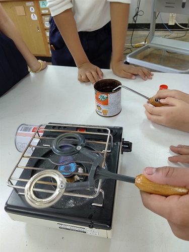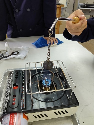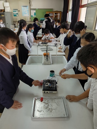 理科で、「金属も温度によって体積がかわるのだろうか」の実験をしています。