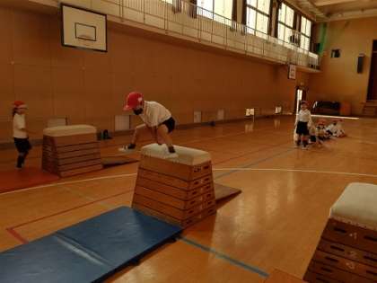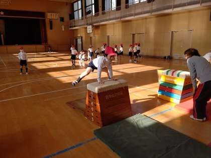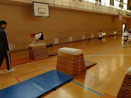 体育館でとび箱の練習をしています。