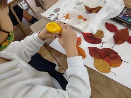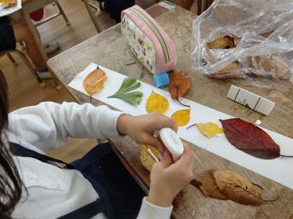 昨日、中央公園に「おちばひろい」に行き、収穫してきた落ち葉を使って、作品を作っています。