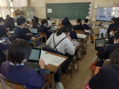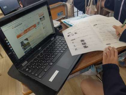 英語で、「ご当地当てクイズをしましょう。」の学習をしています。Chromebookを使って、日本各地のご当地を調べて、クイズを作っています。
