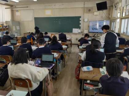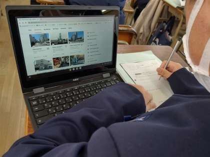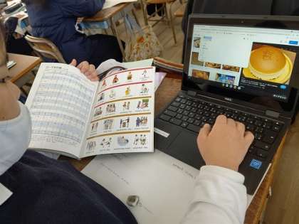 英語で、「This is my town. パンフレットを使って自分の町を紹介しよう。」の学習をしています。Chromebookを使って、自分の町にあるものやできることなどについて調べています。