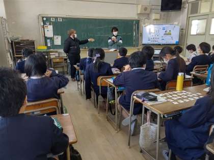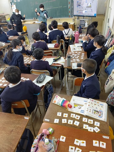 C−NETの先生と、飲食店でのいろいろな料理や食べ物の絵カードを使って、英会話の学習をしています。