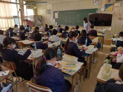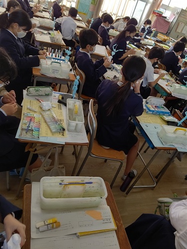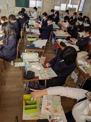 図工で、人の芯材に紙ねんどや絵の具を使って「未来のわたし」の作品を作っています。