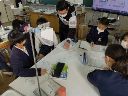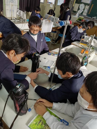 理科室で、ふりこの実験をしています。「おもりの重さを変えると、1往復する時間は変わるのだろうか」の問いを確認しています。