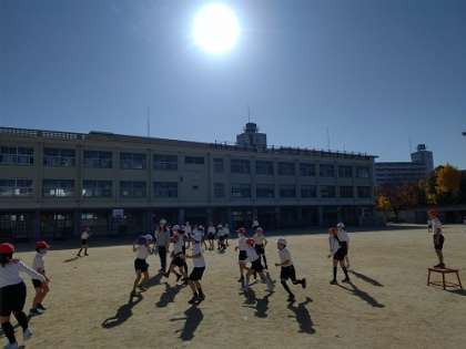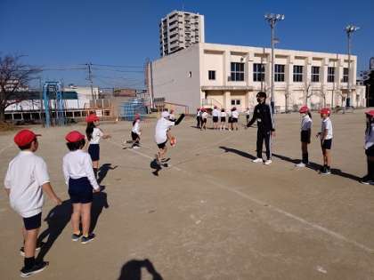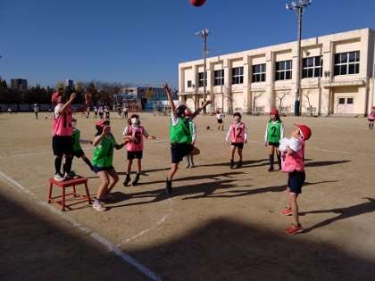 運動場で、ポートボールと大縄跳びの練習をしています。