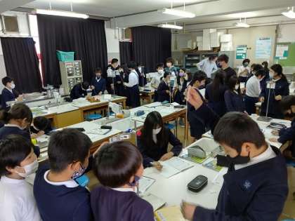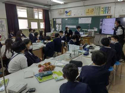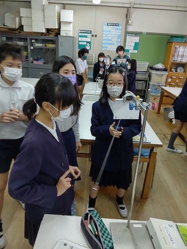 5時間目に理科室で、5年1組の理科の研究授業を行いました。ふりこの実験をしました。「ふりこの長さを変えると、1往復する時間は変わるのだろうか」の問いを確認しました。