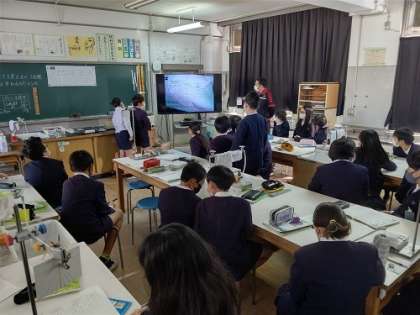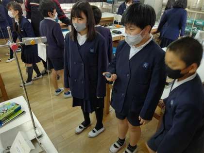 理科室で、ふりこの実験をしました。「ふりこの長さを変えると、1往復する時間は変わるのだろうか」の問いを確認しました。