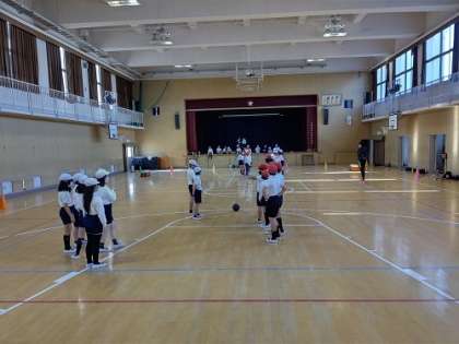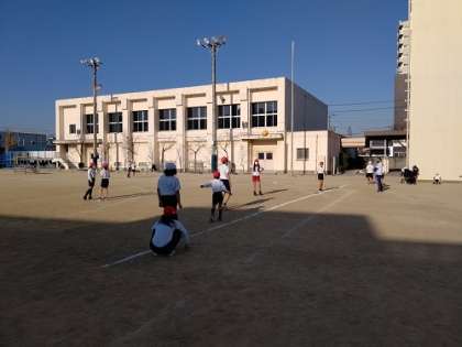 運動場でキックベースボールを、体育館でポートボールをしています。