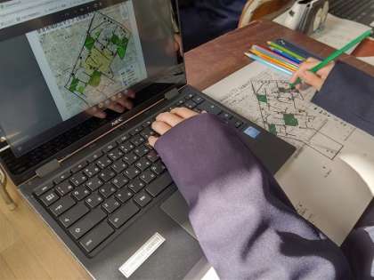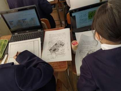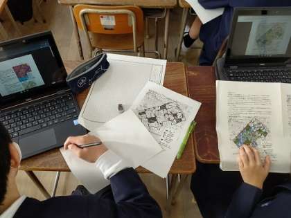 理科で、豊里(東淀川区)のハザードマップを作っています。Chromebookを使って、自然災害による被害の軽減や防災対策に使用する内容を調べたり確認したりしました。