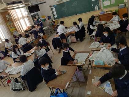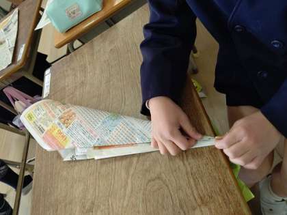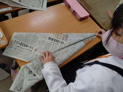 新聞紙を使って、飛行機を作っています。