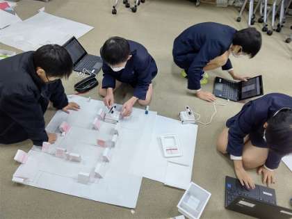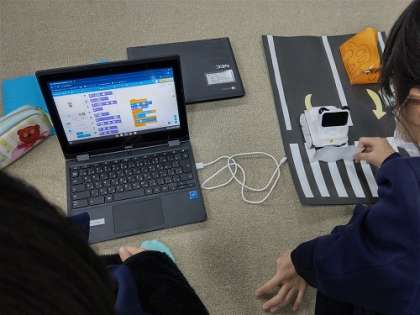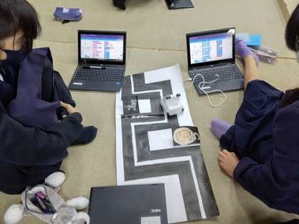 多目的室で、Chromebookを使って、mblockのソフトでプログラミングを行い、code rockyロボットを制御しています。めあてとして「安全な車のプログラムを考えよう。」ということで、距離センサー等を用いて様々な動きのプログラムを考えています。