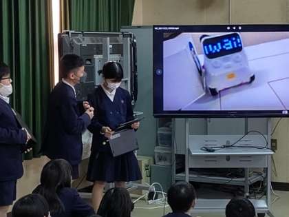 多目的室で、各班で協力して発表会を行いました。code rockyロボットを距離センサー等を用いて制御するプログラムで動かし動画を撮影し、紹介しました。