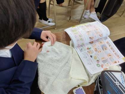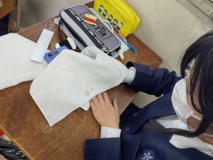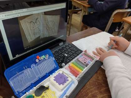 家庭科で、布に刺繍をしています。Chromebookを使って、デザインを考えています。