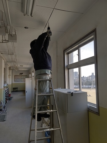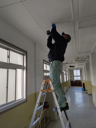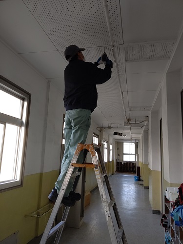 管理作業員さんに、天井パネルの浮いているところを直してもらっています。