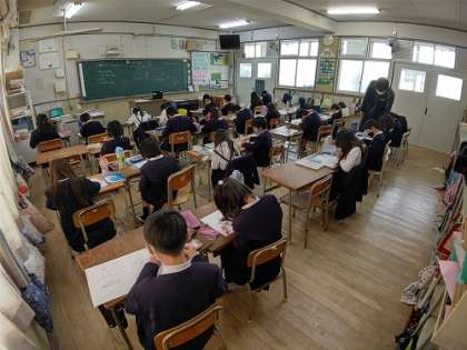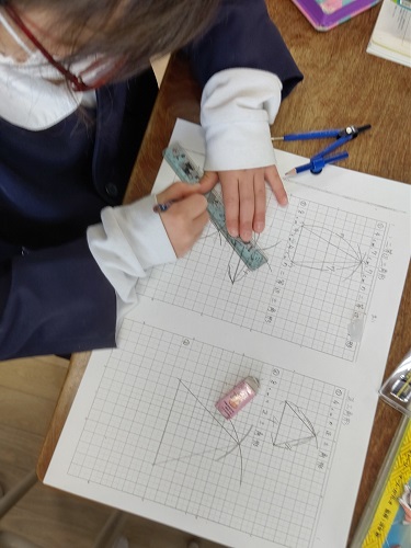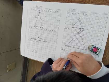 算数で、コンパスと定規を使って、二等辺三角形と正三角形をかいています。