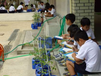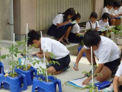 2年生の児童が順調に生育している「ミニトマトの観察日記」を仕上げていました。
