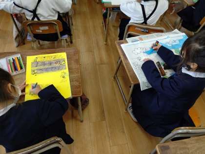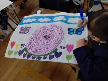 学用品を持って帰るための大きな袋に絵を描いてます。