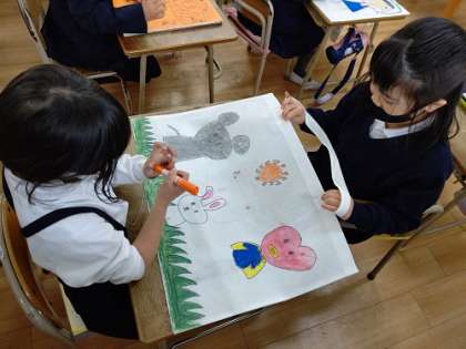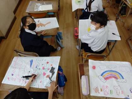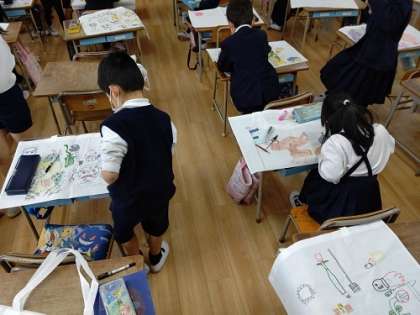 学用品を持って帰るための大きな袋に絵を描いてます。