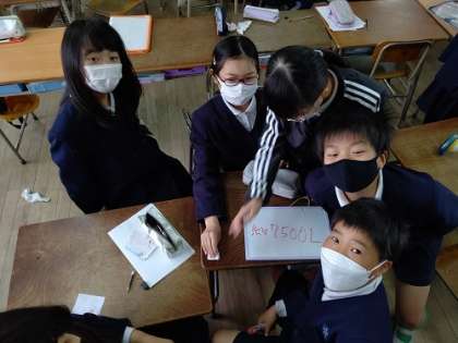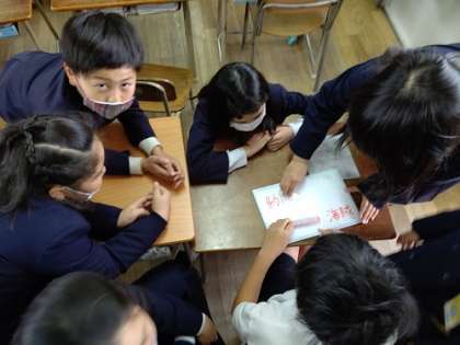 算数の問題を班で協力して解いてます。