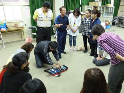 緊急時の対応のしかたや心肺蘇生の方法を丁寧に説明していました。