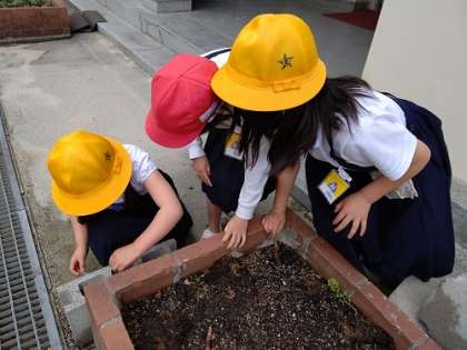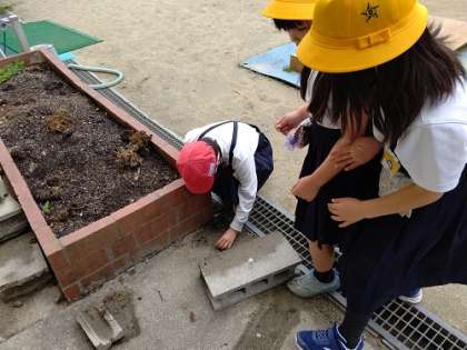 ブロックのすき間や裏をみて、だんごむしを見つけました。