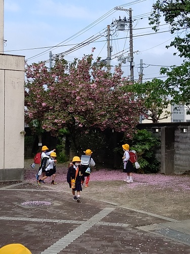 八重桜の花びらが風で舞って、子どもたちへ花吹雪になりました。