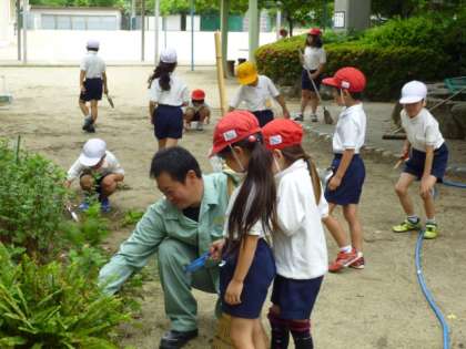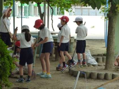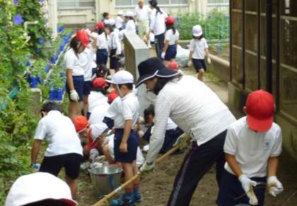 先生や管理作業員さんと一緒に、一生懸命に清掃活動。