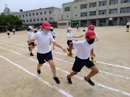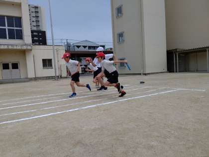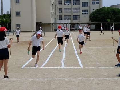 体育で、50m走で、スタートからバトンパスをしてゴールまでを計測しています。