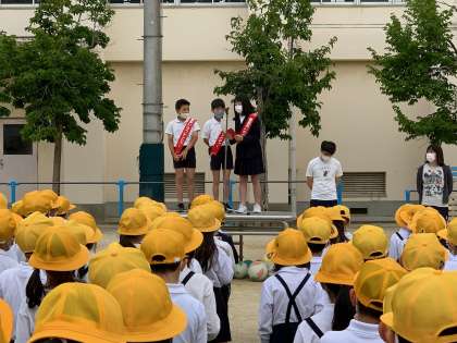 最後に、運営委員の児童からあいさつ週間についてお話がありました。お話の後、みんなで大きな声を出してあいさつの練習をしました。