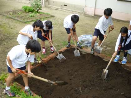 新しい黒土20袋、くん炭(もみがらの炭)、肥料をたっぷりといれ、前からあった土と混ぜ合わせます。