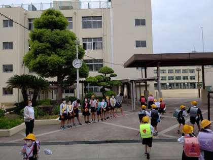 あいさつ週間の2日目です。あいさつレンジャーの皆さんが、登校してくる児童を「おはようございます!」と元気よく迎えてくれています。