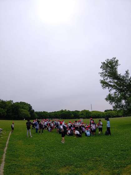 大芝生広場で集合です。オリエンテーリングの説明を受けています。