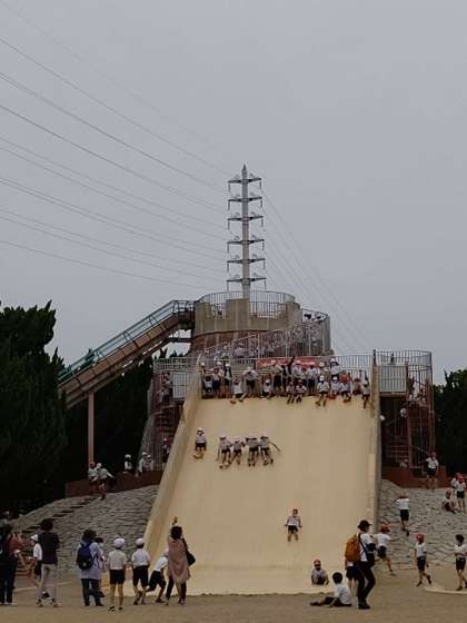 大きな大きな滑り台があります。みんな何回も滑っています。