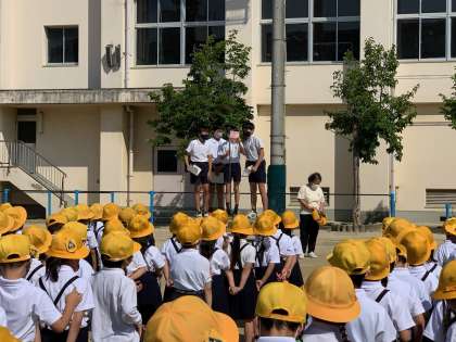 まず、校長先生から「急に天気が変わって雨が降ったり雷が鳴ったりすることがあります。天気予報を確認して雨具の用意をしてください。」「まだ飛べない子どものカラスが、芝生や学習園を行ったり来たりしています。親のカラスが様子を見守っています。危ないですので、子どものカラスには近づかないでください。」とお話がありました。
