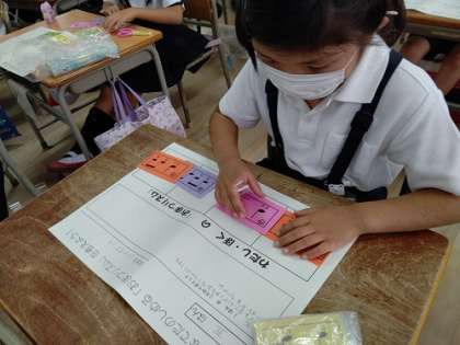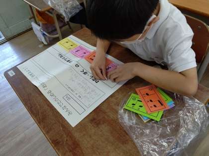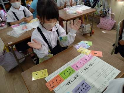 一人ひとりが、ワークシートを使って、リズムカードで「おまつリズム」を作っています。
