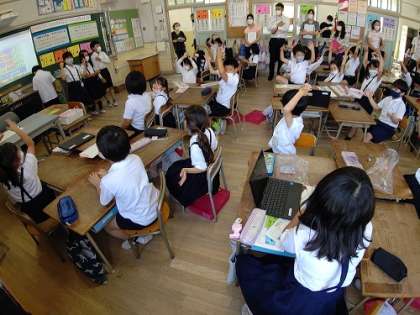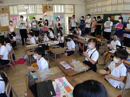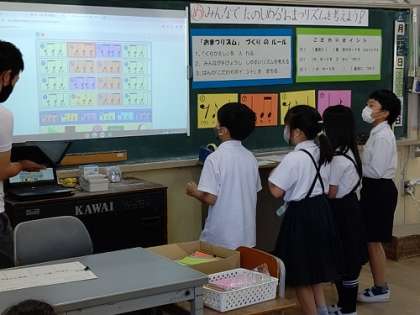 グループで作成した「おまつリズム」をみんなの前で発表しました。みんなにも「おまつリズム」に合わせて、手拍子してもらいました。