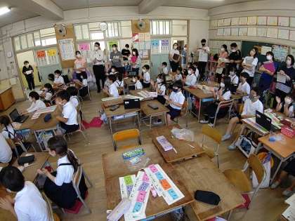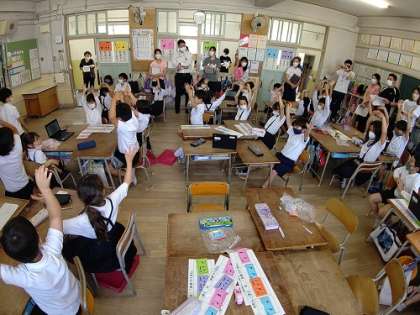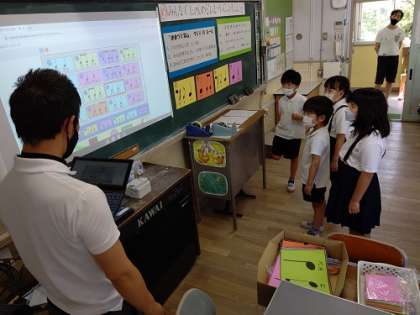 グループで作成した「おまつリズム」をみんなの前で発表しました。みんなにも「おまつリズム」に合わせて、手拍子してもらいました。