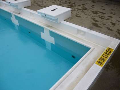 プールの水深は約40cm、入る学年の身長に調整です。(ちなみに、前の授業は3年、使用後一気に排水、次の授業は2年、再び一気に給水です)