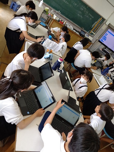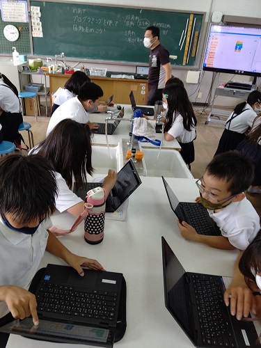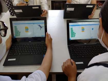 chromebookを使って、スクラッチのソフトで図形を描く、プログラミングの学習をしています。