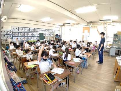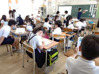 英語で、「どんな遊びをしたい友だちが何人いるかたずね合い、表に書こう。」の学習をしています。