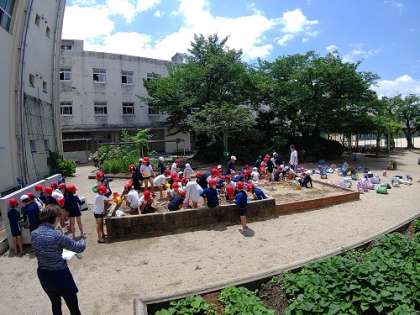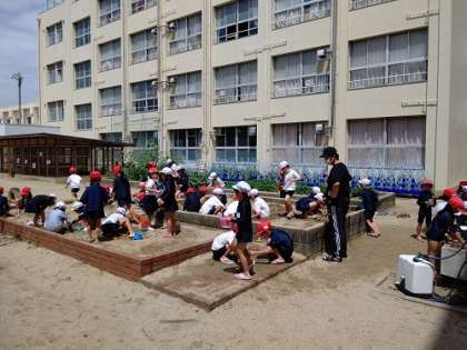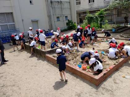 プール前に、砂場での砂遊びをしました。