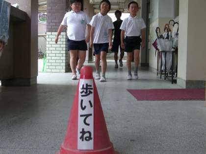 職員室前には「歩いてね」と書かれたコーンが置いてあります。